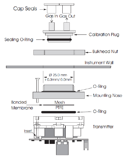 Mounting nose installation kit for 3 series size sensors (calibration/test gas cap plug with cap seals, mounting nose, o-ring, filter, screws)